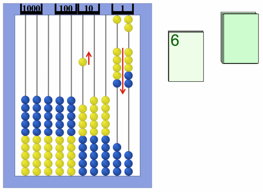 Move 10 beads down from ones column (as shown above) and one bead up to the tens column. To keep it competitive, we made a big deal out of it by yelling, “TRADE!” to show the other players that they were moving closer to the goal.