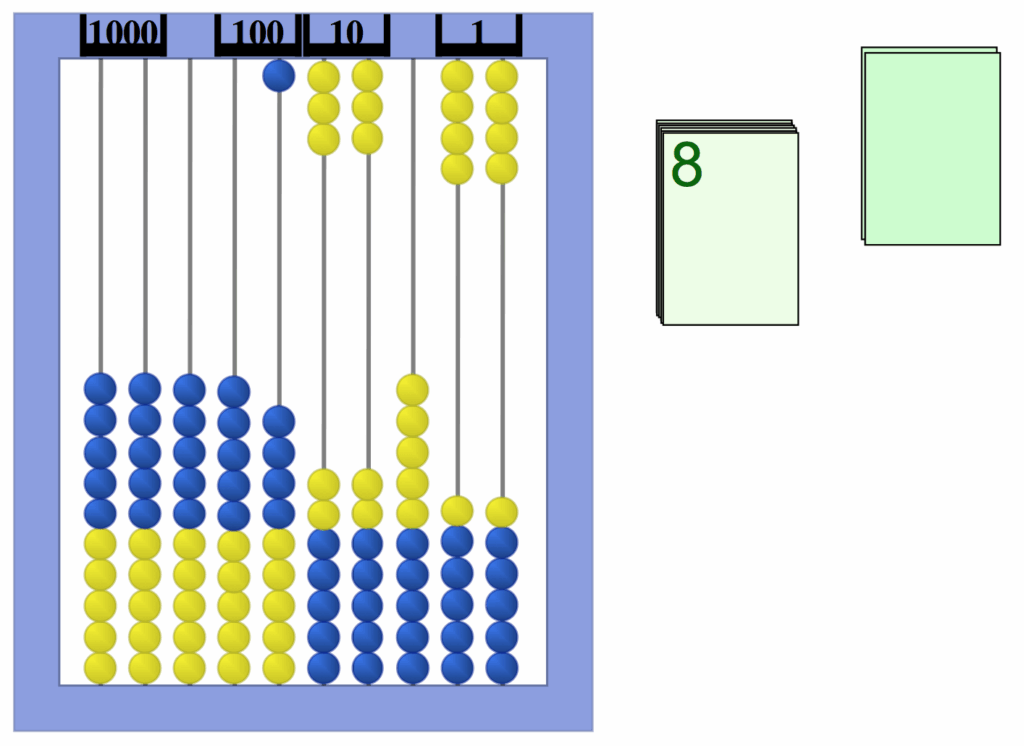 The deck of basic cards is placed face down in the center of the table. This is a race game, so you do not need to take turns. The players move as fast as they can. Each person draws a card, looks at the number, and moves that many beads on the wire. For example, if the player draws a three, he will move three beads in the ones place on the abacus.