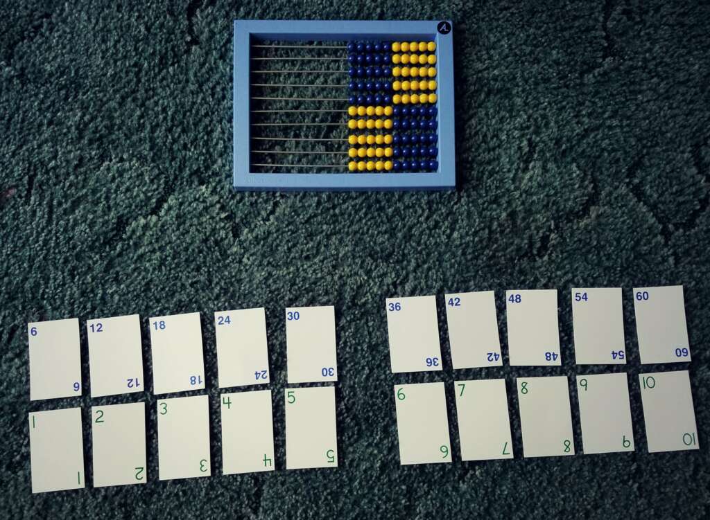 You will also pick out a set of multiples from the Multiplication Cards. If your child is a beginner or still learning their multiplication facts, you can pick out a set they need work on. We’re going to use 6s today. Make sure you shuffle them well.
