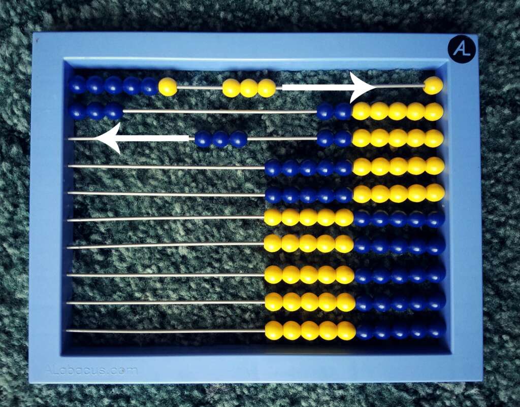 You are now left with six beads on the top row, so you can take away another set of 3 beads and enter another group of 3 beads on the fourth row.