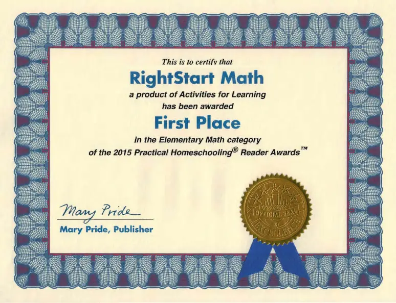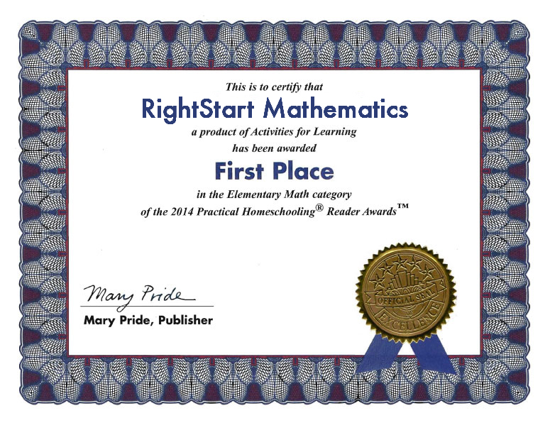 TWELVE YEARS IN A ROW! RightStart™ Mathematics has been honored again with FIRST PLACE from Mary Pride’s Practical Homeschooling Readers Awards in the Elementary Math category.