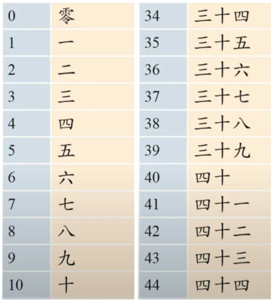 In the first column below, see the figures for the numbers 1 through 10. Now look at the top of the second column: 34 is written as 3 ten 4. And 35 is 3 ten five. Look at 41: 4 ten 1.