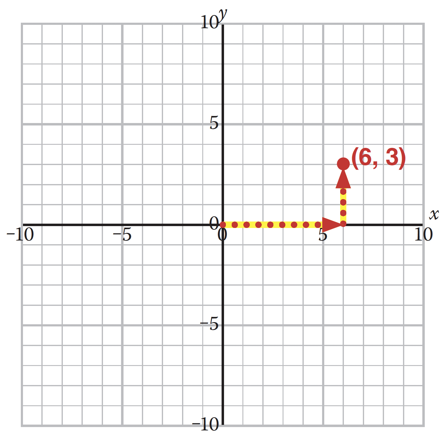 Note how this interpretation also corresponds to the Cartesian coordinate system. Representing the 6 × 3 array with 6 across in 3 rows is similar to finding a point (6, 3) on a grid. The first number, 6, indicates the horizontal number and the 3, the vertical number.