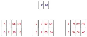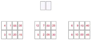 Deal one color deck to the children – each child will have an equal number of hour cards and an equal number of minute cards. Cards to be placed face up on the playing area. We are looking at three players here sitting side by side.