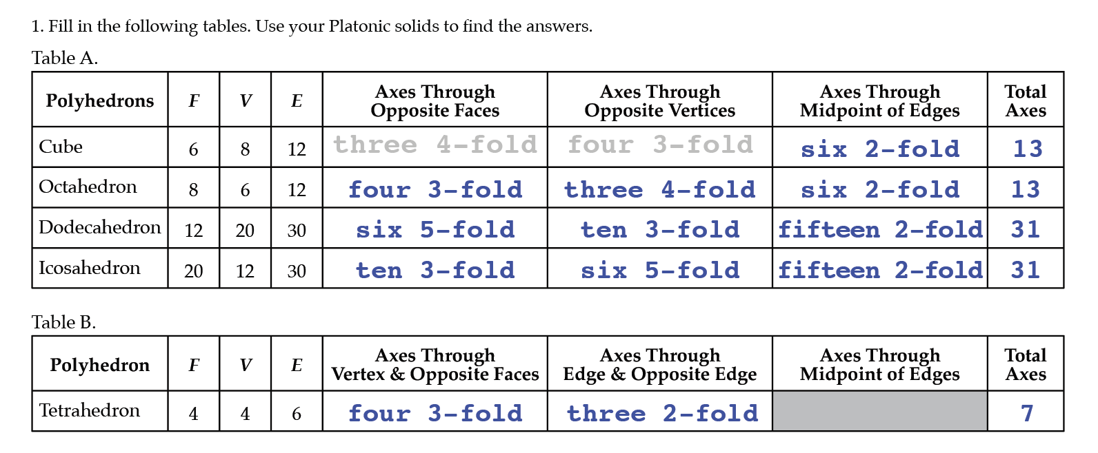 Problem 9, Round 2. A dodecahedron has 12 faces. I know this because I know what a dodecahedron is and, well, it’s in the chart! Axes through opposite vertices? 10. The chart says so and I figured this out during my first go-around with this problem. 12 faces x 10 axes = 120!!
