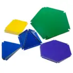 RightStart™ Geometry Panels include: 32 blue triangles, 30 yellow squares, 12 green pentagons, and 20 purple hexagons, as well as rubber-bands to hold them together. Edges are 10 cm. Instruction booklet included.