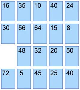 So, once we have our cards laid out in random order, we want to find the highest card, 80 in our game here. Take that card and set it aside. This creates a gap into which a neighboring card can slid into, keeping the five by four grid layout as we slide the cards around.